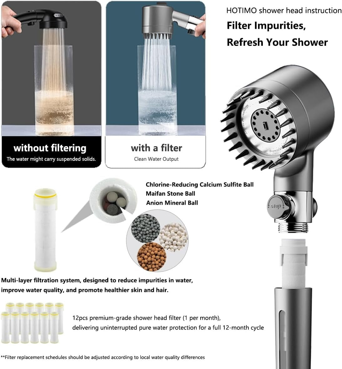 - FILTERED SHOWER HEAD: 12 Replaceable Water Softener Filters. Upgrade your bathing experience with the Shower Head with filters for hard water. Multi-layer filtration system,designed to reduce impurities in water, improve water quality,and promote healthier skin and hair. The easy installation process ensures you can start enjoying fresher showers in no time. We recommend that you replace the filter cartridge every 1-2 months depending on water quality and usage.